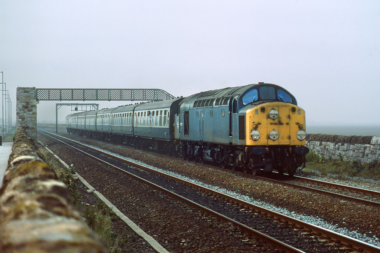 Welcome to the summer in Wales! 40118 emerges from the gloom at Ffynnongroyw on 22 August 1984 with the 1G90 16:40 Llandudno to Birmingham New Street additional. Additional is not a word that is in the railway's vocabulary these days, although cancelled most definitely is! This was the last summer of Class 40 passenger workings, so every train was worth photographing. |