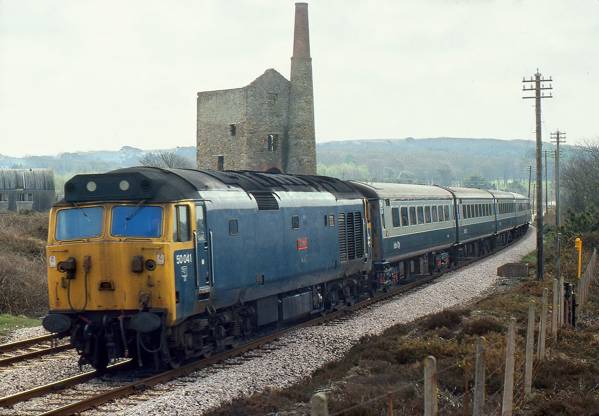 With a background like this, it could only be Cornwall. 50041 Bulwark passes the engine house of a long closed tin mine at Scorrier on 27 April 1979 with an unidentified working. In the early nineteenth century the 'Scorrier Penny' was issued, as a form of local currency for the tin miners. |