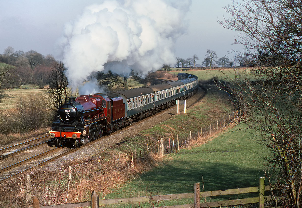 Just managing to avoid the shadow from a rogue cloud, LMS Jubilee Class 4-6-0 5690 Leander rounds the curve at Little Stretton on 28 January 1984 with the SLOA Sheffield to Euston 'West Mercian' railtour, which the loco worked as far as Hereford. |