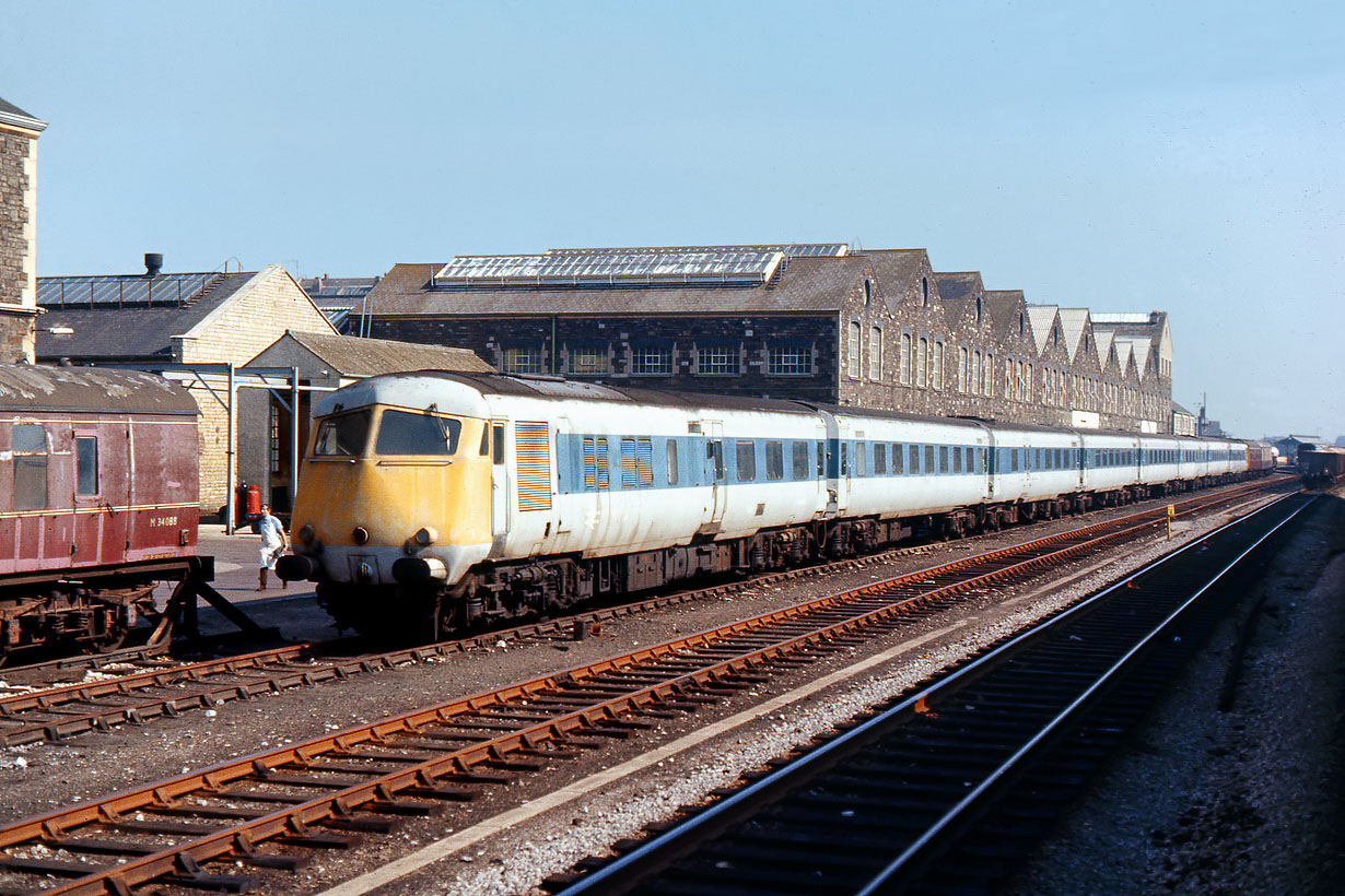 The ground breaking Blue Pullmans were withdrawn from service in May 1973, but this eight coach unit languished outside Swindon Works for a couple of years, before finally being broken up in 1975. It is pictured here from a passing train on 12 September 1973. The original Nanking blue livery was replaced by this largely white colour scheme in the late 1960s. |